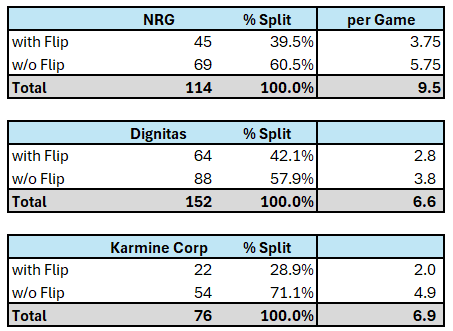 - While NRG mixed Flip/No Flip similar to Dignitas, Karmine Corp used Flip significantly less
