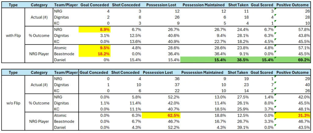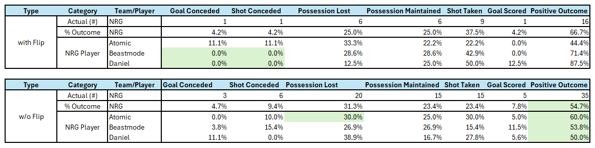 - NRG increased the positive outcome of Flip challenges vs prior, with Beastmode and Daniel near not conceding any shots or goals against